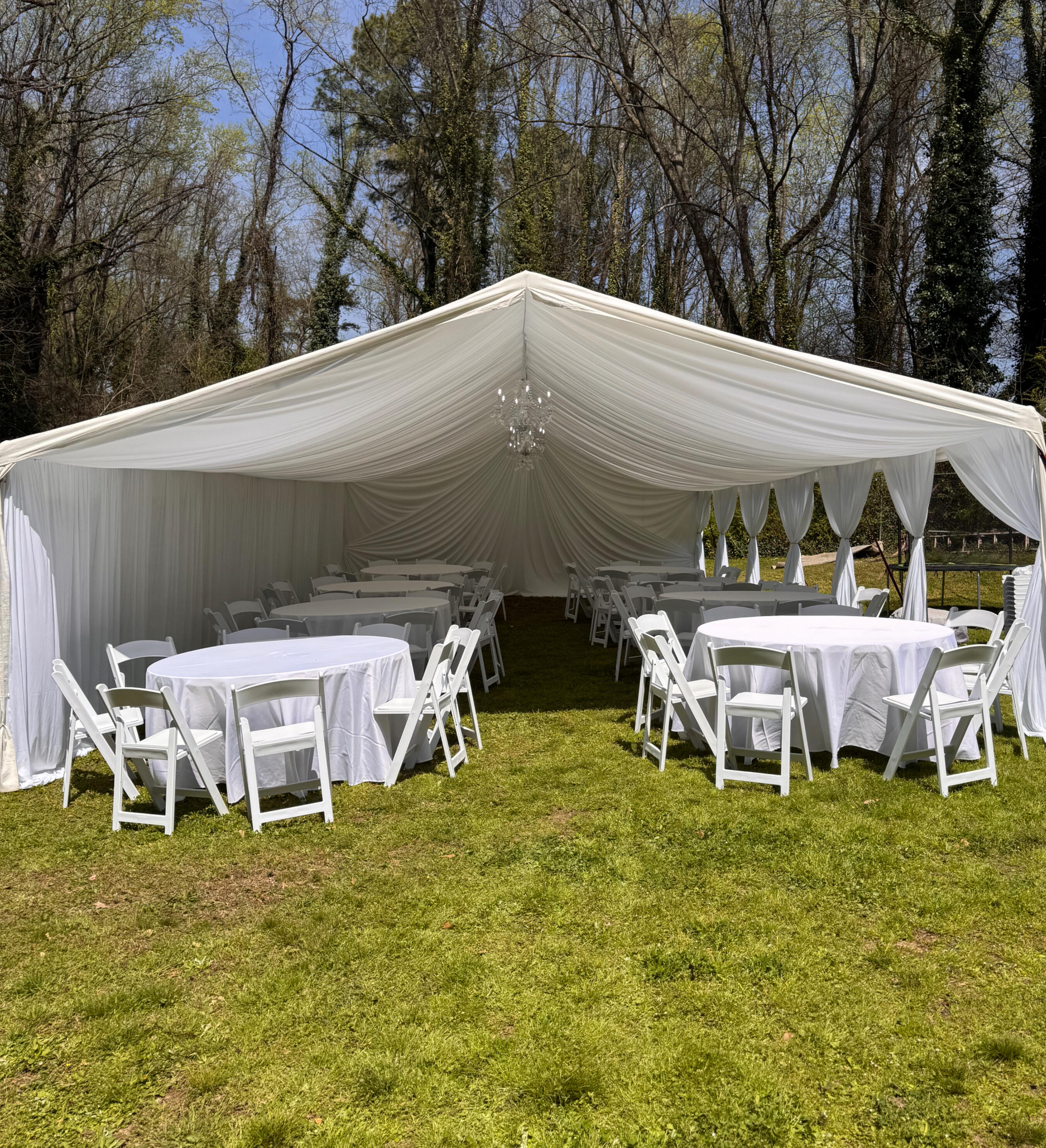 We completely drape the tent in a luxurious fabric from ceiling to floor, installing chandeliers that add elegance, a true upscale feel. Elegant Setups for Weddings, Baptisms, First Communion, Bridal Shower, Baby Showers, Gender Reveal, Birthdays, Private Events, and much more.